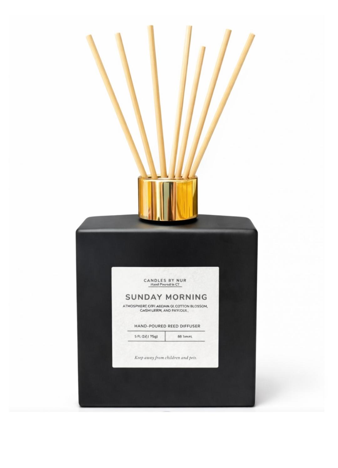 Sunday Morning is a soft, airy reed diffuser that captures the calm beauty of a slow, peaceful start to the day. Bright lemon gently awakens the senses, while delicate cotton blossom and orange blossom add a clean, comforting floral touch. Fresh linen and light ozone notes evoke sun-drenched sheets drifting in a gentle breeze.